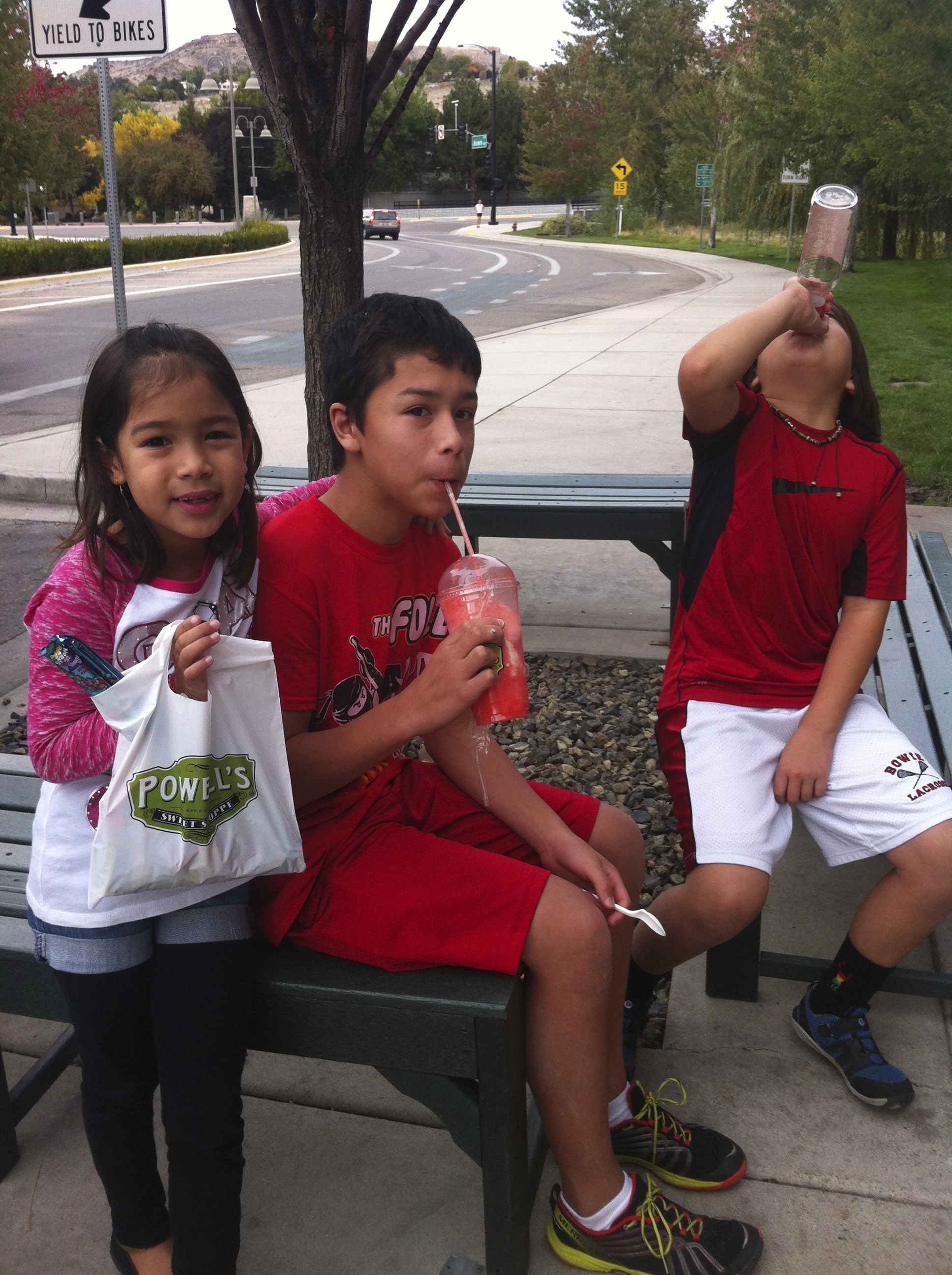But the fun highlight for all were the two days we spent celebrating Gabe’s 12th birthday. Poor kid knew his b-day would fall in Boise and that he wouldn’t likely have any friends around. We joked, saying that we’d put an ad out on Craigslist to hire out friends to come to a party for him. But in the end, he had a total blast. He was blessed with cards and gifts all day long from family and friends who sent him books and money! Brooke and Ava Maculley had 2 days off school, so we pretty much had a two-day party, hitting the donut shop, toy shop, YMCA for rock climbing and b-ball, skate rink, and yogurt shop, mixed in between geocaching for 12 finds, playing soccer with Mt. Rushmore friends, and watching School of Rock. Whew!