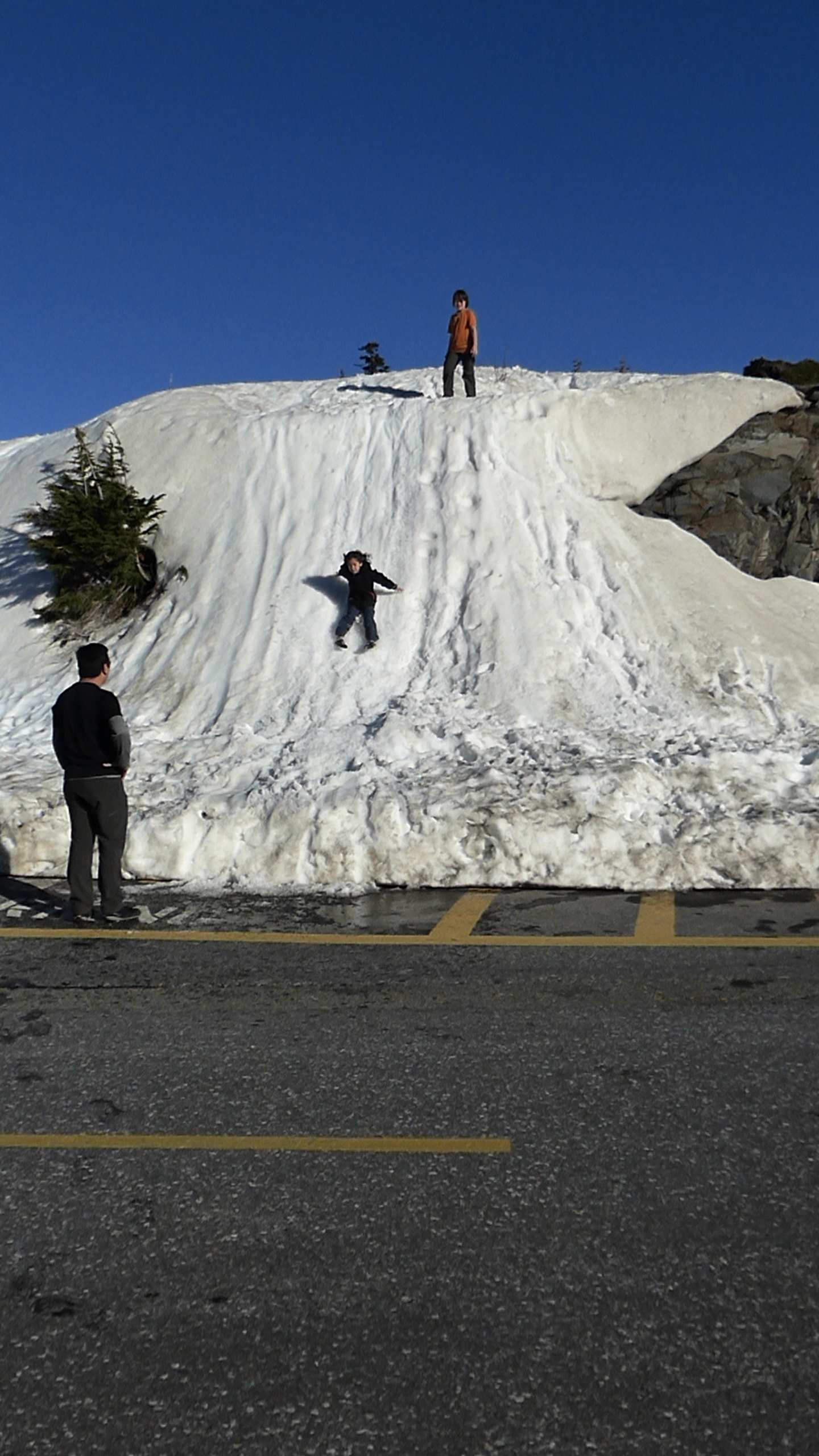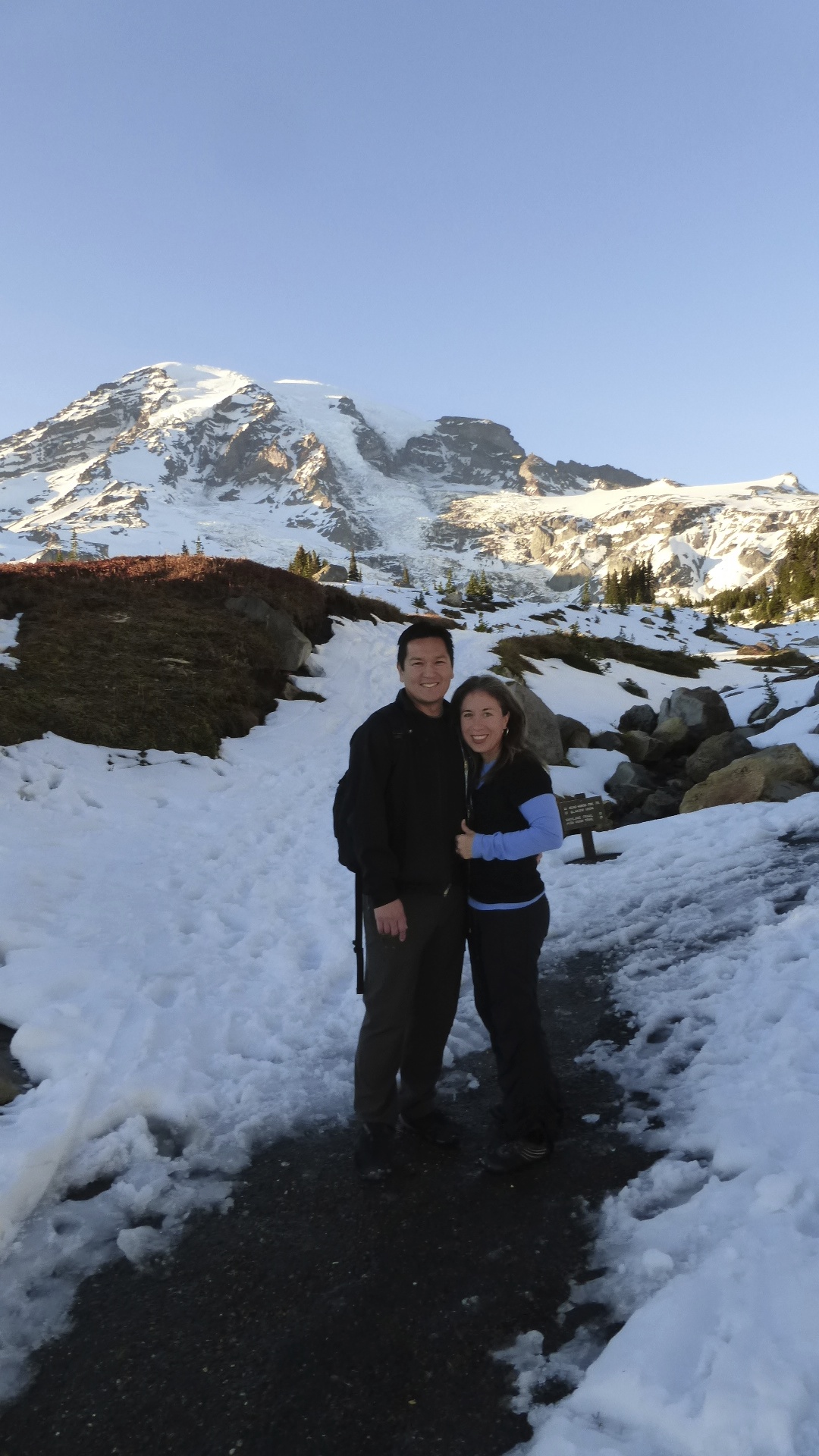 We drove through the switch-back roads climbing to Paradise, which offers a fantastic visitor center and excellent view of Mt. Rainier. There are also several hiking trails leading from there. We didn’t realize though, that they are all paved with snow! I’m sure there are a couple months where they are not white, but only a couple I hear. We were unprepared, but ventured forth anyway.