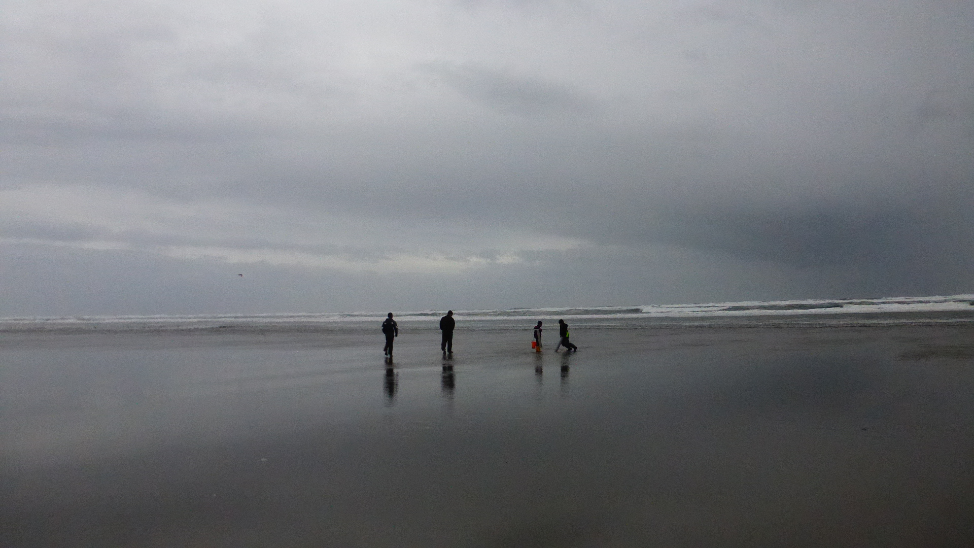 We walked around in the low tidal waters and searched and searched for those little “donuts” in the sand everyone said to find. But we just didn’t see any. We did see a dark rain cloud a ways off, though. Which of course came our way. We stuck it out, still in search for those donuts and clams.